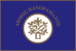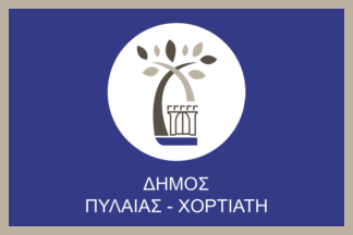 The flag of Pylaia-Chortiatis (photo) is blue with a light grey border, the municipality's emblem in a white disk and its name below.