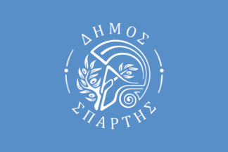 The flag of the former municipality of Sparta ((photo, photo, photo) was celestial blue with white Greek ornaments on the four sides, a representation of the head of the statue of King Leonidas and the the words ΔΗΜΟΣ ΣΠΑΡΤΗΣ.