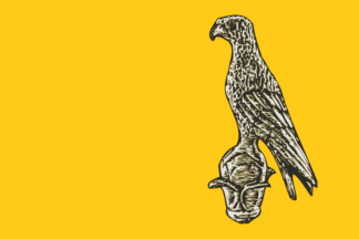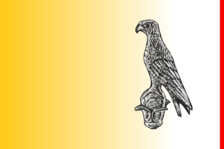 Flags of the University of Ioannina are yellow with a hawk toward the fly. Some flags fade the yellow out toward the fly and have a narrow red stripe down the fly edge.