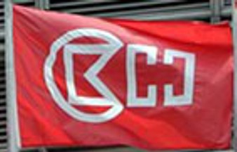 Red flag with a white lozenge charged with IMC in blue, the letter M being bigger than the two others.