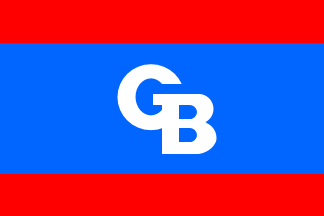 Shown as a drawing on the website, the house flag(oid) is blue with narrow red stripes horizontally edging the field; white combined - and partly overlapping - initials "GB" appear in the centre, the first letter higher. This design also appears on funnels.