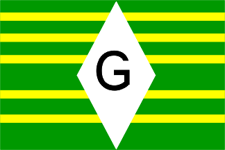 Green flag with 5 horizontal yellow stripes, white diamond, black "G".