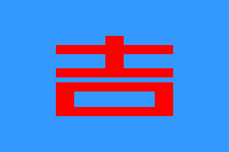 Large image of house flag, light blue bearing a red Chinese character (explanation most welcome - thanks in advance): http://www.gogostone.com/picture/jizhou/3272008613152633.jpg