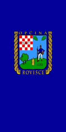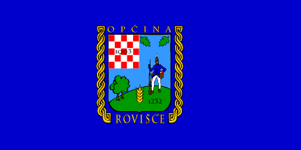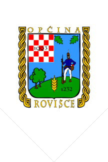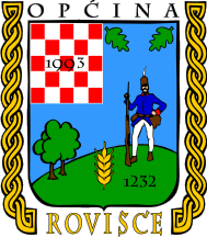 The coat of arms (municipal website) is "Azure on a mount vert in sinister a guardsman statant clad in jacket purpure, white trousers, red cap and jacket facings, belt with gear proper and holding an upright long rifle, in dexter a tree grove proper and in between a corn ear or, in canton checky gules and argent, 5 x 5, and in chief sinister two oak leaves vert, inscribed in base sinister '1232' and over the canton '1993'. Encircled with a golden triple wattle bearing the inscription, above 'OPČINA' and below 'ROVIŠĆE'".