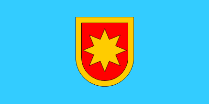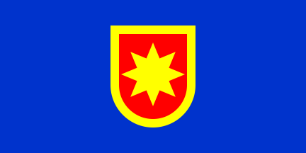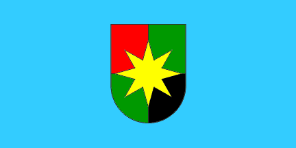 The flag is use (photo), however, is medium blue. When the current coat of arms was adopted in 1996, the flag description was not changed, retaining the flag field described