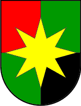 ... in a shield shape. It is coloured red bordered with golden (yellow). In the centre of the coat of arms is a golden (yellow) eight-pointed star.