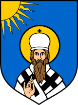 The coat of arms in blue is an image of St. Basil of Ostrog with a golden halo accompanied by the sun rising from the upper right corner.