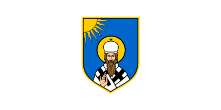The ceremonial flag is a white gonfalon with three tails ending in a triangle, the middle one longer, with an ornament of oak branches in each of them. In the middle is the coat of arms of the municipality bordered in gold, above it in two arcs the name of the municipality in Latin and Cyrillic, and below the coat of arms in a yellow ribbon on a blue reverse with the name of the saint written in gold in old Cyrillic letters. Table flags of the same appearance, but rectangular in shape with a triangular end, are in use.