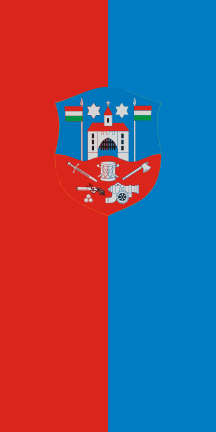 red and blue with Coat of Arms in the center, proportion 2:1.