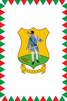 Its flag is white with green and red wolf-teeth, and with its coat of arms in