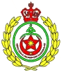 The arms are a green octagon bearing crossed swords and a