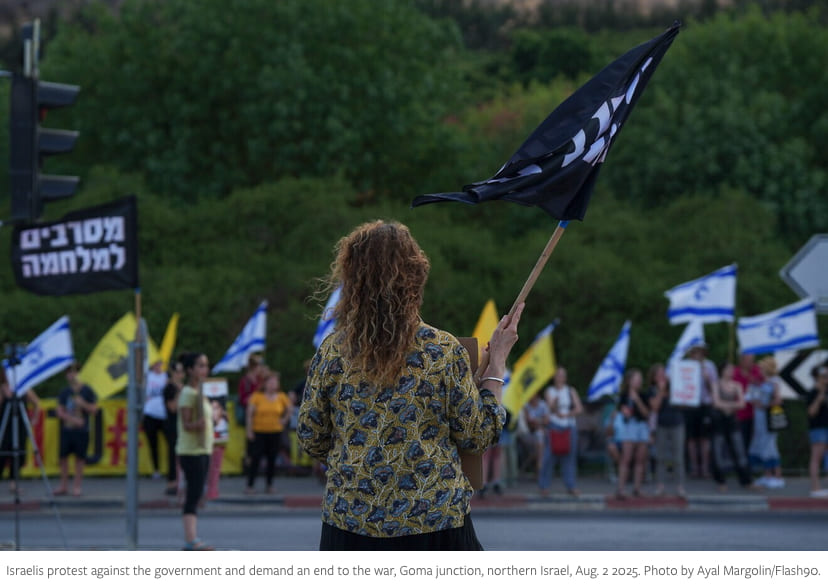 Anti-war protest flag, used by protesters at Goma junction, northern Israel, 2 August 2025.