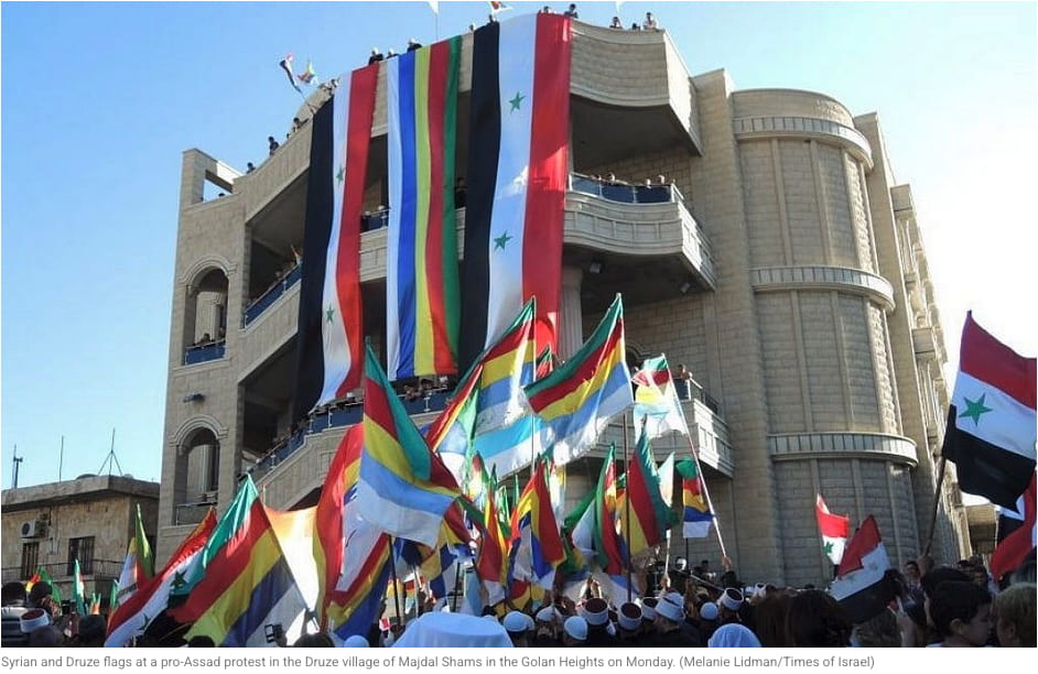 flags at a pro-Assad protest in the Druze village of Majdal Shams in