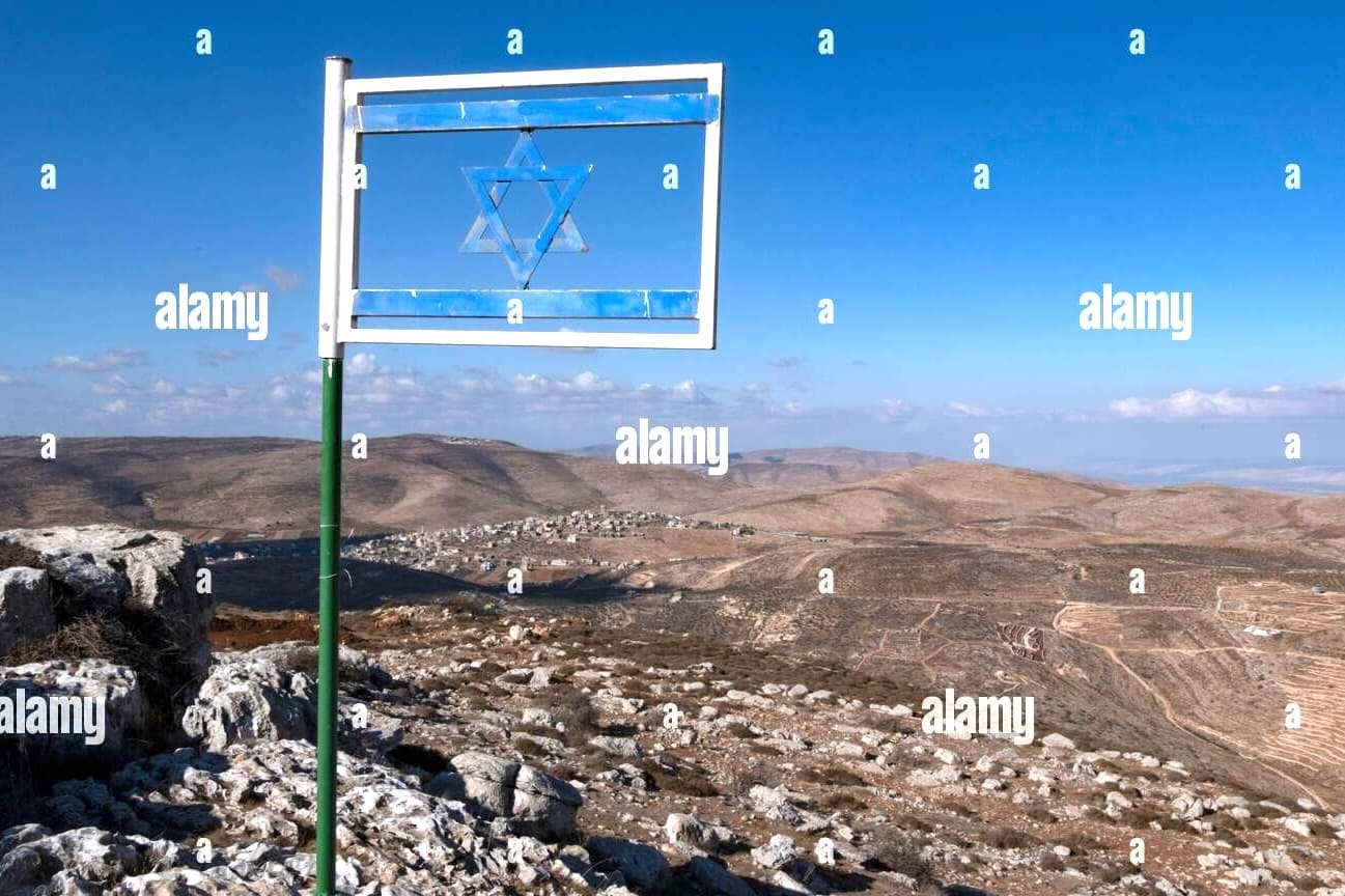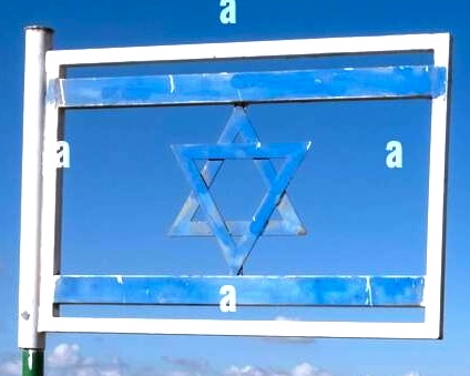 image located by William GarrisonCaption: The Israeli flag made from steel placed at Matan Lookout overlooking the hills of Samaria also