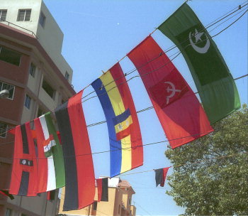 name (Vizarat Rasool Khan) on the bottom edge of a red (?) flag with a white (?)