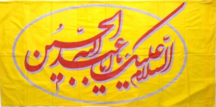 From https://ashuraaa.wordpress.com/2012/12/05/ashura-006/. The red slogan on the flag reads "Ya Hussain" ["Oh, Hussain"], which is an appeal that he intercede favorably with the flag holder. He was the third Shia Imam, and who was martyred in Karbala, Iraq c. Oct. 680 CE. The faintly readable wording above "Ya Hussain" is a famous hadith of Prophet Muhammad that reads: "Inn al-Husain misbahul-huda wa safinatun-najat" that symbolically means that "Husain is the lighthouse of Islamic guidance for the lost ships [souls} and he is their rescue ship."
