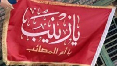 A red-field flag with the white Persian/Farsi slogan "Ya Zinab al-Kobra/Kubra" perhaps better known as "Zaynab bint Ali". Zaynab (c 626–682), was the eldest daughter ("bint") of Fatimah and Imam Ali, and was the granddaughter of the Muslim prophet Mohammad. She is best known for her role in the aftermath of the "Battle of Karbala" (680CE), in which her brother Hussain/Husayn and most of her male relatives were massacred by the forces of the Umayyad caliph Yazid ibn Muawiyah. Women and children in Husayn's camp were taken captive after the battle and marched to the Umayyad capital Damascus, where Zaynab gave impassioned speeches, condemning Yazid and spreading the news of Karbala. She was later freed and died shortly afterwards in 682. A shrine is dedicated to her in Damascus. She is considered to be a symbol of sacrifice, strength, and piety in Islam, and a role model for Muslim women, typifying courage, leadership, and defiance against oppression. The flag's hoist is most likely on its right. This flag was seen draping the coffin of Iranian Brig. Gen. Razi Mousavi, a senior commander in the "Quds Force" of Iran's "Islamic Revolution Guard Corps" (IRGC) [who was killed on December 25, 2023, in an Israeli airstrike outside Damascus] during his funeral procession at the Imam Ali shrine in Iraq's holy city of Najaf on December 27, 2023. During Mousavi's burial ceremony in Tehran, his coffin was draped with the national flag of Iran. Various Shiite militias operating in Iraq, Lebanon, and Syria are named after her. Essentially, this flag is an appeal by its carrier asking Zaynab to spiritually intervene in supporting the Shiite flag bearer's cause in overcoming some disorder.