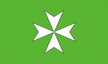 The parish flag shows a silver Maltese Cross on a green background.
