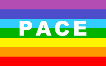 blue, green, yellow, orange and red, with the word PACE inscribed in