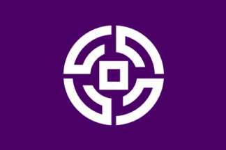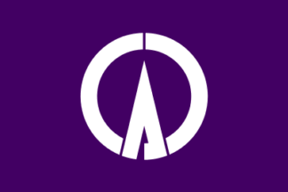 The town emblem was adopted on Sep 3rd 1959 but there is no flag law. The purple flag has a white town emblem in the center. The town emblem is a combination of four (Shi) stylized katakana ク Ku and a stylized katakana ロ Ro in a form of an ancient coin. It represents the wealthy town.