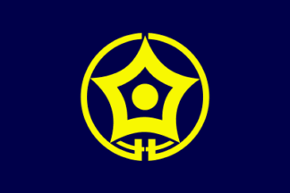 The town emblem was adopted on Nov 11th 1950 but there is no flag law. The blue flag has a yellow town emblem in the center. The town emblem is a stylized kanji 白 Shira and katakana ヌカ Nuka. The circle symbolizes peace and solidarity and the pentagon does the extension of the town’s five major industries.