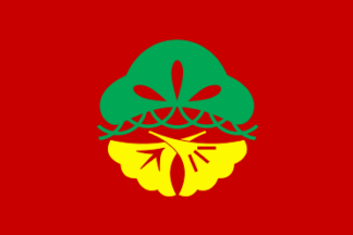 The flag of the former town of Kizukuri was red with mark. The town is now, from 2005, part of the city of Tsugaru.