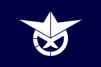 dark blue flag has a white town emblem in the center. The town emblem is a
