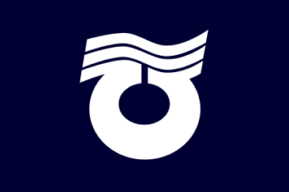 The town emblem was adopted on Mar 1st 2007 by Notice No 11 but there is no flag law. The white flag has a blue and a light blue two color town emblem in the center. The town emblem is a stylized hiragana ひ Hi of Higashiagatsuma. The upper part symbolizes Agatsuma River running east and west thru the town and the wave does a breath of nature. The blue color stands for a blue sky and a bright future.