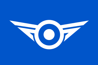 The town emblem was adopted on Jan 22nd 1960 but there is no flag law. The blue flag has a white town emblem in the center. The town emblem is stylized kanji 甘Kan and katakana ラ Ra in a form of a flying pigeon as symbol of peace. The circle symbolizes a peace and a concord of the town. It represents a wish for the town to make a leap forward and develops.
