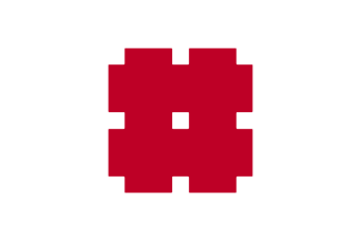 The white flag is charged with a red city emblem in the center.