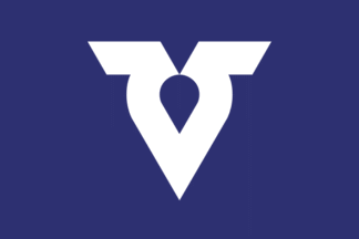 blue flag has a white city emblem in the center. The city emblem is a stylized