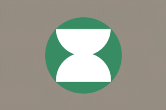 The grey flag has a green and a white two color village emblem in the center. The village emblem is a stylized kanji