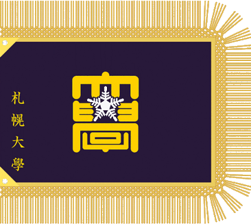 Located in Sapporo City Hokkaido Prefecture and established in 1967. The embroidered ceremonial flag has purplish blue background with a gold and silver emblem and vertically written in gold kanji university name in gold fringe. The university flag has purplish blue background with a yellow and white emblem in the center. The university emblem features a pentagonal crystal motif, whereas snow crystals, which symbolize the nature of Hokkaido, are usually hexagonal in shape. It was adopted as the emblem of Sapporo University when the university was founded in 1967.