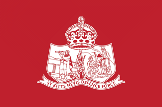 Red field with the emblem of the Saint Kitts and Nevis Defence Force outlined