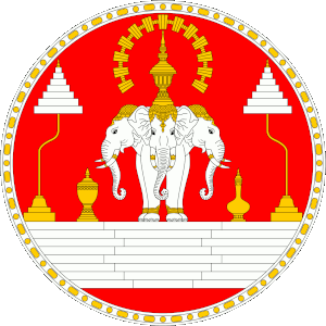 Editorial Note: The above is one rendition of the Royal flag and arms of Laos. The current arms are located at: http://www.columbia.edu/~rs392/laos_soulivong.html