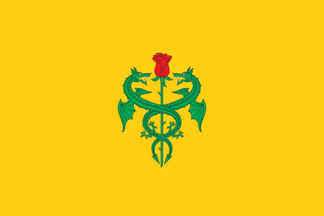 The flag is a deep yellow field, with a stemmed red rose embraced by two green dragons intertwined.