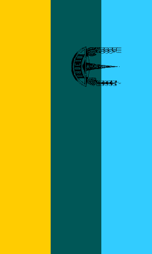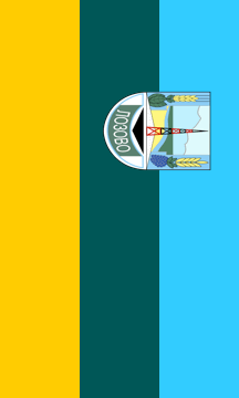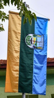 overlapping the two upper stripes of the flag. The emblem is a rendition of the municipal emblem, which shows a landscape with a