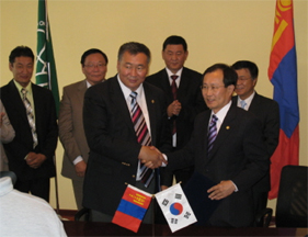 This picture ( http://eng.me.go.kr/... 1187252119.JPG, source: http://eng.me.go.kr/...) shows on left an image of a flag that seems to be Mongolian but I cannot identify it.