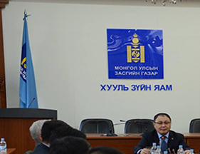 I cant read mongolian but GoogleTranslate sais inscription on this logo is "GOVERNMENT OF MONGOLIA". I think any governmental ministry or agency may use this logo. But the inscription under the logo is "Ministry of Justice"