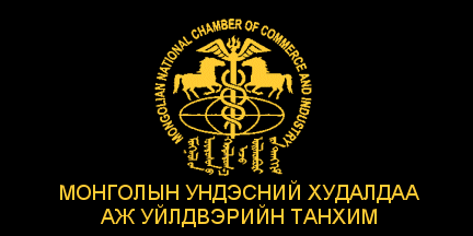 The flag is a black horizontal flag with an inscription and logo in the middle, in yellow, as seen here (flag on the right): http://www.mongolchamber.mn/en/images... (source: http://www.mongolchamber.mn/en/index.php/...).