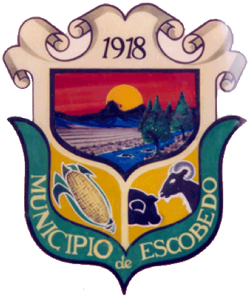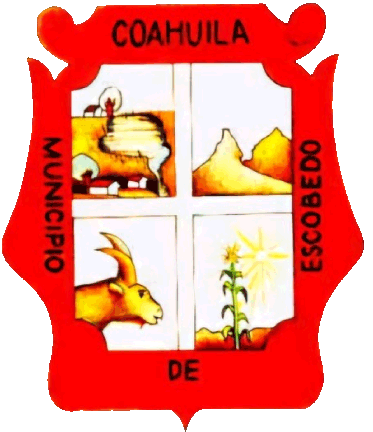 I was informed the municipality did not have information regarding the municipal coat of arms. The border has the form of two women; formerly, there was an hacienda here called Hacienda Hermanas (sisters), apparently the property of two sisters, today Ejido Primero de Mayo. The border reads "MUNICIPIO DE ESCOBEDO", COAHUILA at the top. It is divided into four sections by a cross. The upper-left section depicts the thermal waters of Ojo Caliente, as the background houses and trees; the upper-right the mountains of the municipality. The lower-left depicts a goat, fauna of the region. To the lower-right, a corn plant on soil growing under the sun.