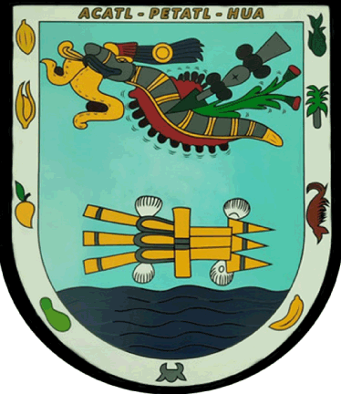 The council informed me the coat of arms of Acapetahua was adopted in 1956, being designed by José Guadalupe Méndez; the council informed me that it was made official "in that year" of the administration of Municipal President José Flores Rivera (1976-1979). I can not verify if this information is true or not, but it appears it may not be a modern creation. The shield has a white border, reading "ACATL-PETATL-HUA", the Nahuatl name for the area, at the top. Going around the border are fruits of the area and elements of its local economy: cacao, corn, mango, papaya, cow head for cattle-raising, banana, shrimp, palm tree for its tropical environment, and fish. In its inner area, it depicts at the top. At the bottom, waves are seen as a representation of the coast which the Municipality has. Just above the waves, a serpent with feathers is depicted as an allegory of Quetzalcoatl, meaning "Feathered Serpent", indicating the Aztec faith of its founders. Under this, arrows are seen with shells on its sides, indicating its name which means "Place of petates of reeds" (petates being bedrolls/mats).