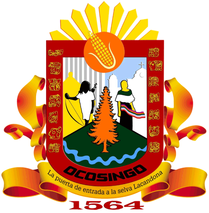 The council informed me their coat of arms was first used on 18 December 2009, being adopted through a contest organized by the Municipal Secretary, in which Rafael Sánchez Lara was recognized as the winner and designer of the municipal coat of arms. The shield has to its sides orange ribbons. At the bottom, an orange ribbon reads "La puerta de entrada a la selva Lacandona" [The port of entry to the Lacandona jungle]. Under this, the year 1564 is read, the year Friar Pedro Lorenzo de La Nada moved people from Pochutla to Ocosingo, sometimes recognized as its year of foundation. Above the shield, the rays of the sun emerge, recognizing its importance in daily life. At the top of the shield, which has a red border, a cob of corn is found in an orange disc, basic aliment of the people. At the bottom of the border is its name, OCOSINGO. To the sides of the border are Maya hieroglyphs, recognizing the historical Maya sites especially in the eastern part of the Municipality. In its inner section, it is divided into two halves with a green triangle at the bottom. The triangle depicts an orange tree, representing its flora; by it, a river flows likely representing the Jatate River that flows along its boundary. On the right half, the San Jacinto de Polonia church is depicted, with an indigenous woman in Tzeltal attire holding a ribbon. On the left half, a building (probably pre-Hispanic) is seen with a black Indian in front carrying a bow and a quiver, a direct representation of its name which means "place of the black man".