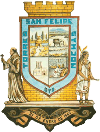 The lower-left section depicts the unfinished towers of the San Felipe Apóstol church, as the church towers remained unfinished for a long time. The lower-right section depicts a man realizing works of pottery, one of the principal economic activities of the place. The border reads "SAN FELIPE TORRES MOCHAS GTO." (from the top to the sides then bottom). Above the shield is a tower, signifying the local name of "Torres Mochas" [cut towers]. The sides of the shield depict a friar and Indian, signifying the fusion of races. Under them is a pedestal, having a ribbon that reads "21 DE ENERO DE 1562", the date of its foundation.