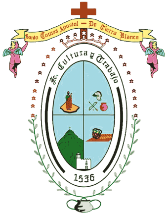 The council informed me their coat of arms was adopted in November 1995, the author of the symbolism being Prof. León Rodríguez García, with the design being created by graphic designer Nahúm Rodríguez Viñez; both local residents. The shield was created through a call for submissions launched by the Administration under Municipal President Salvador Hernández Romero (1995-1997) and had a jury to judge the designs. Above the shield in oval form, there is a crown and cross signifying the Spanish conquest and missionaries. Over the cross is a ribbon that reads "Santo Tomas Apostol - De Tierra Blanca" [St. Thomas the Apostle of Tierra Blanca], held up by two angels signifying the conquest of this place through the saint's name. Going around the upper half of the shield are 25 stars, signifying the points used to create the municipal boundaries, by conquistador Nicolás de San Luis Montañez; the bigger star represents the municipal seat.