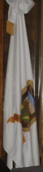 The flag of Cerritos is white with its coat of arms centered upon it.