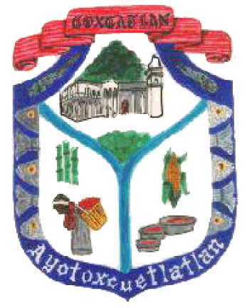 which reads "COXCATLAN". Its border is blue and reads "Ayotoxcuetlatlan" at the bottom, its old name. It also depicts many heads and tails of tilapia fish on the edges; at the top are two crawfish, as the people of the town are known as mojarreros or cozoleros, which mean the same. The shield is divided into three sections, one at the top and two on the sides, by two arroyos that form a "Y" shape: one is from the El Zapote ranch and the other from Ajuatitla. Above it has foliage, as the area is very green. The upper section depicts the Cerro del Alcuanco, meaning "high hill with a hole and lagoon water". In front of this, the San Juan Bautista church is depicted, founded by the Spaniards. The left side depicts a laborer with a basket of oranges, as Coxcatlán is also known for its oranges; sugarcane is seen above which is used for the creation of piloncillo, although not on a large scale but still common here. The right side depicts a cob of corn, basic aliment of the people, and a pool of water known as El Zocote, where many people bathe.
