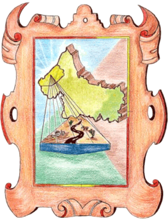 The council informed me their coat of arms was adopted in the 1997-2000 term under Municipal President Aurelio Tenorio Quintero. It was designed by a young person from the community of Illescas, named Marlem Rodríguez Escobedo. It was adopted through a call for submissions from the council, presented during the regional fair of the Municipality in August 1998. The shield has a scrolled border in brown, with a square in the center depicting a 3D map of the state of San Luis Potosí. The contour of the municipality is highlighted, with rays presenting, on a 3D rectangle, the highway that goes through this desert as well as its flora, two cacti; to the right a cow is also visible for the cattle-raising industry. To the left, there are bales for agriculture.