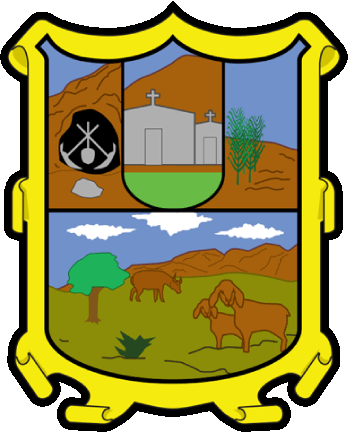The coat of arms of San Nicolás has a golden border with rolled edges, similar to the coat of arms of the State. The inner area is divided in half horizontally and the upper half is divided into three sections. The lower half depicts a scene with the mountains and clouds in the background; in front, a tree (in older versions a yucca plant), cow, 2 goats, and grass (in older versions agave) signifying the cattle-raising industry. The upper-left section depicts a cave with two crossed picks and a shovel in front of it; in front of this is a miner's hat, clearly remembering the mining industry. The upper-center section depicts a church building in front of a mountain and by grass, remembering the San Nicolás Tolentino Mission. The upper-right section depicts corn plants on the ground, alluding to agricultural wealth. Apparently, there is a sword on the coat of arms for defense of the municipality and justice, but not on newer versions.
