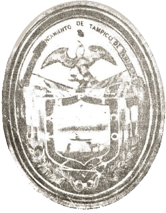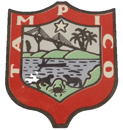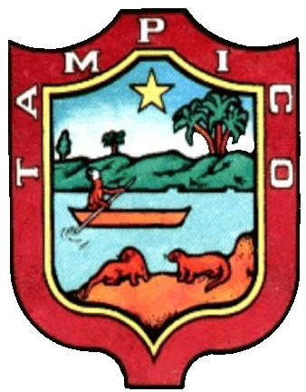 In its colors a river in which an Indian navigates in a canoe representing the primitive inhabitants of the region; on the nearby shore appears two water dogs or otters which abound in the rivers and lagoons of this site and on the opposite shore low hills and two groups of palm trees representing the vegetation of the place; in the axis of the shield a silver star of five points representing hope. Bordered in blue with gold letters and with the legend Tampico. In actuality red is often placed in the border and with white letters Tampico.